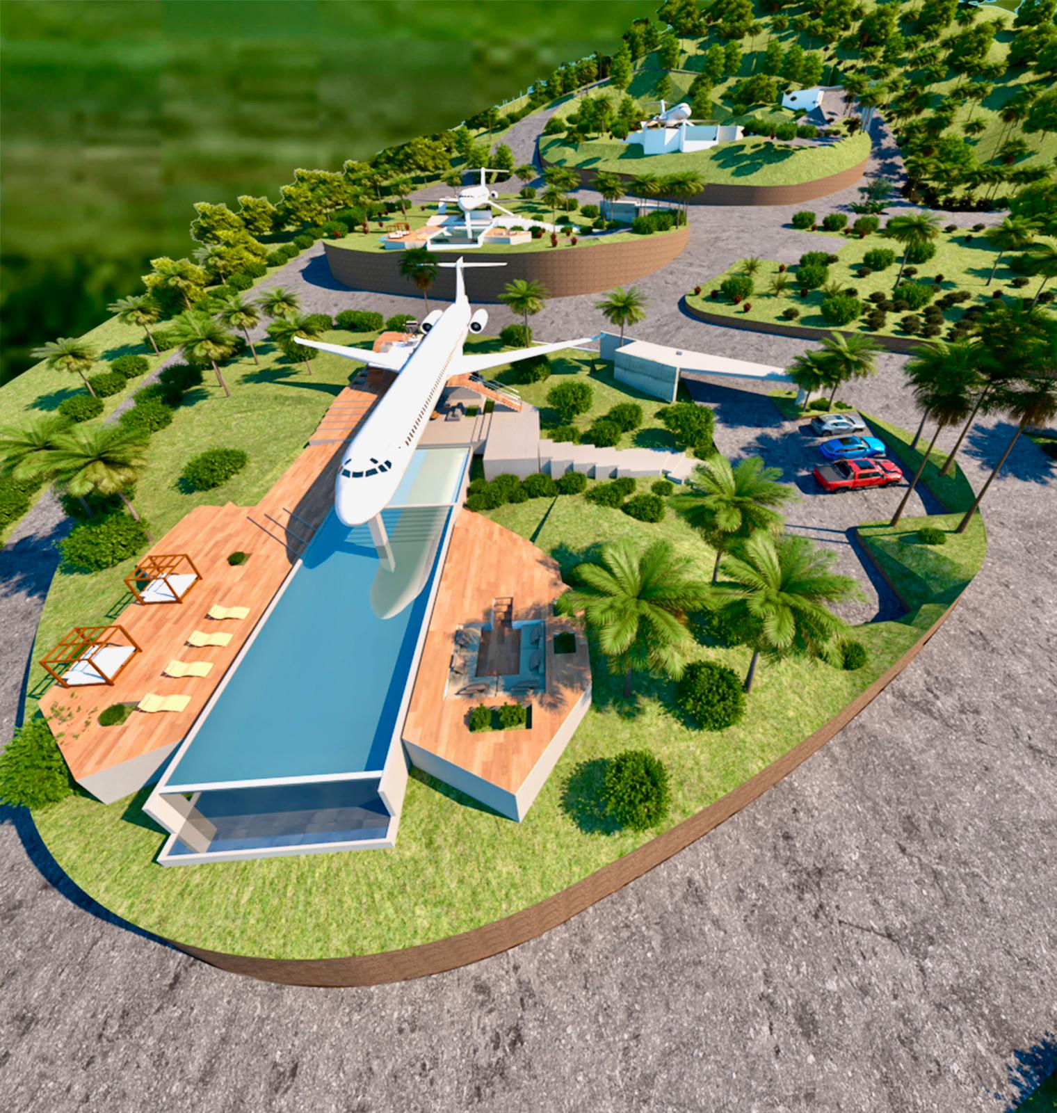 Se trata del aterrizaje de tres aviones en las montañas de la ciudad de Miches; cuyo diseño arquitectónico está a cargo del destacado Arquitecto Carlos Martínez, quien ha integrado los aviones a este entorno de montañas, playas y lagunas para brindar un estilo de hospedaje sin prescedentes.