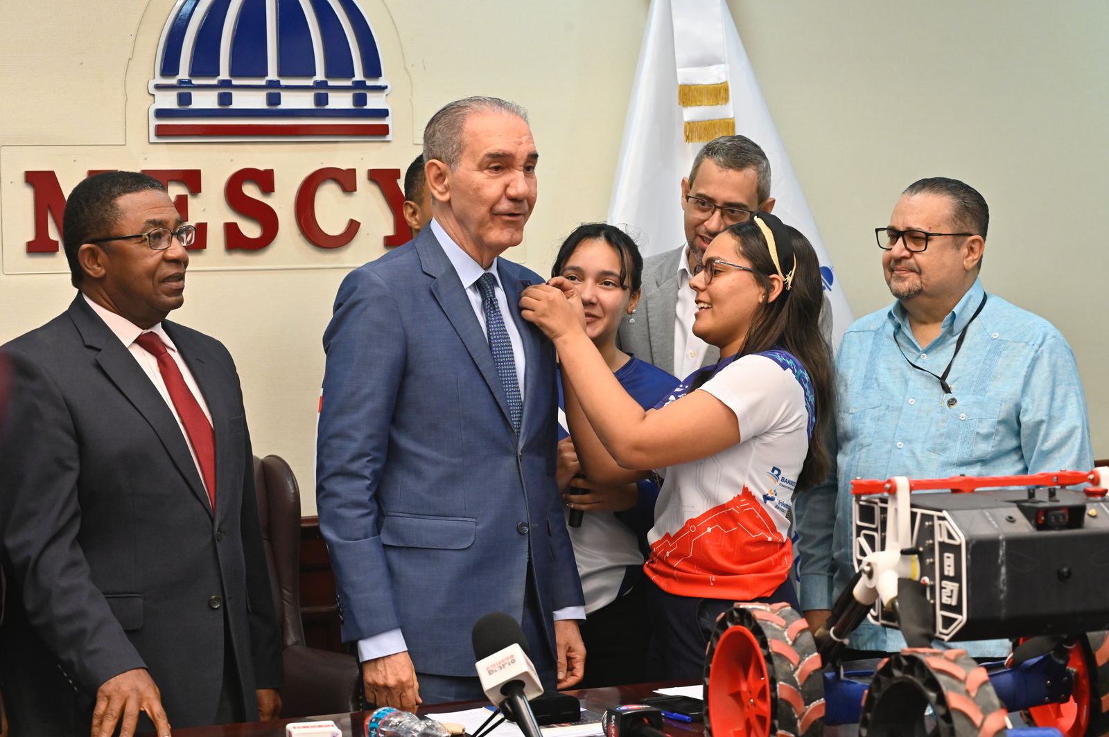 Los miembros del quipo Apolo 27 entregaron al titular del Mescyt, Franklin García Fermín, un pin como muestra de agradecimiento por el apoyo recibido desde la entidad para que los jóvenes logren sus objetivos académicos.
